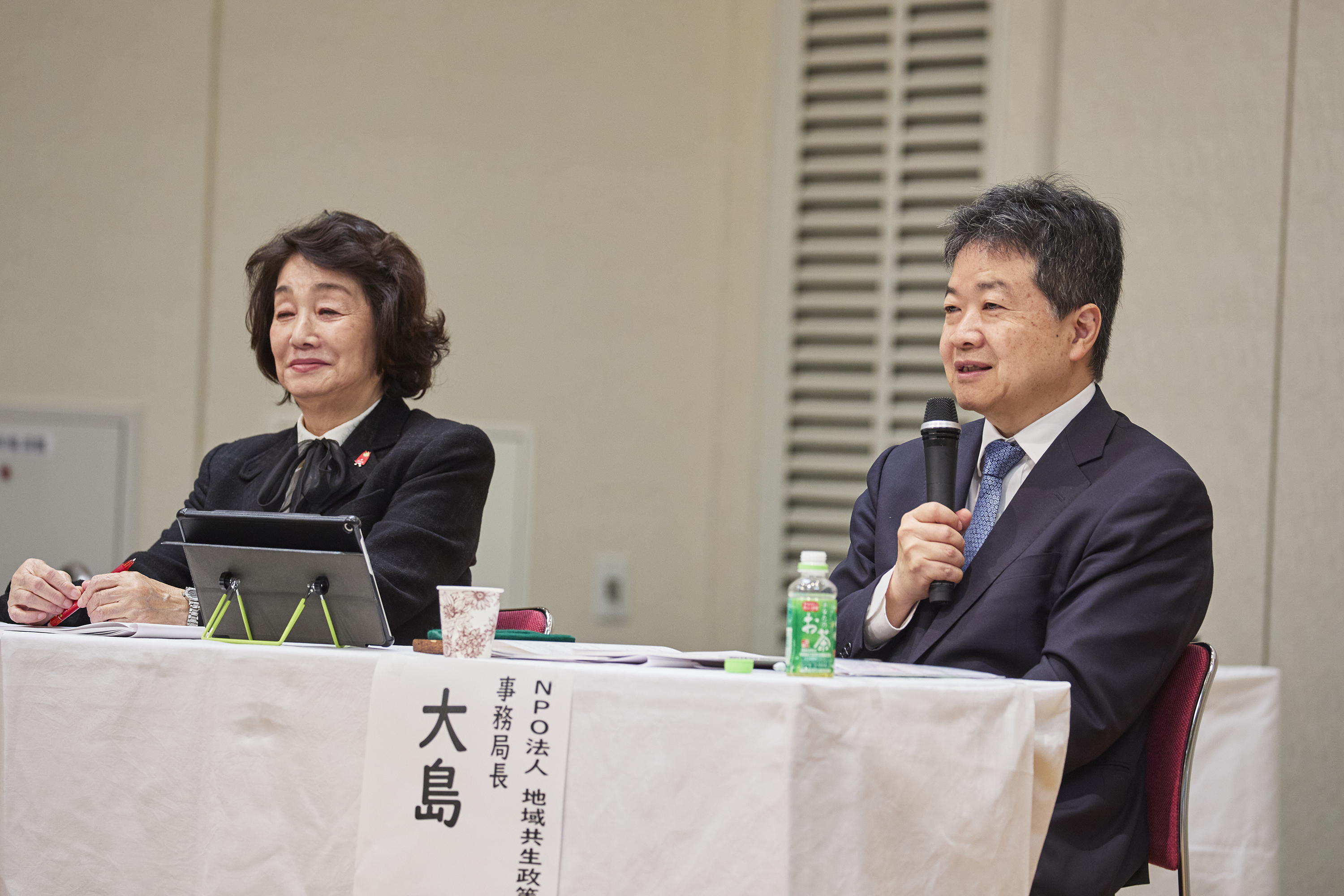 パネリスト:(右)大島 一博(NPO法人 地域共生政策自治体連携機構 事務局長)進行:(左)菅原 弘子(介護サービス相談・地域づくり連絡会 代表)